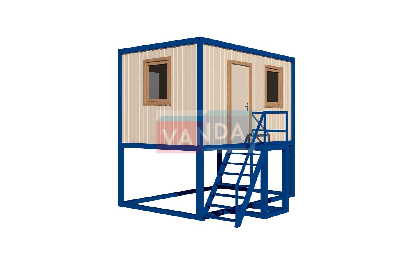 Пост охраны на подиуме №5 (вариант 1) изготавливается из несущего каркаса (верхняя и нижняя обвязка): швеллер 100х50х3 мм., угловые стойки: сложно - гнутый угол 90х90х3 мм., крыша блок-контейнера: металл сварной 0,9-1 мм., качественная наружная отделка: оцинкованный профлист, вспомогательный деревянный каркас (стены) выполнен из брусок 40х75 мм., лаги пола: обрезная доска 40х100 мм., лаги потолка: обрезная доска 40х100 мм., выполнено утепление: Минеральная вата «ISOVER» – 50 мм. и пароизоляция: плёнка техническая, черновой пол состоит из: обрезная доска 20 мм. (2 сорт), чистовой пол покрыт: ДСП строительное 16 мм., отделка пола выполнена из качественных материалов. Контейнер комплектуется окнами: деревянное, двойное остекление 800х1000, входной дверью: ДГ 21-8 обшита снаружи оцинкованным листом, врезной замок и внутренними дверями. Если в БК присутствуют перегородки, то для них используется: брусок 40х50 мм. Лестница постамента имеет перила, тетива лестницы выполнена из профтрубы 30х60 мм., ступени из уголка 25х25х3 мм., просечной лист, перила из профтрубы 20х40 мм., площадка перед входной дверью имеет ограждение.